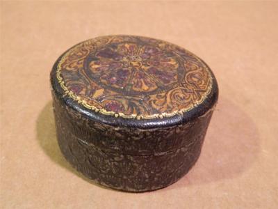 Tooled Leather Patch Box Round Fabric Lined Antique