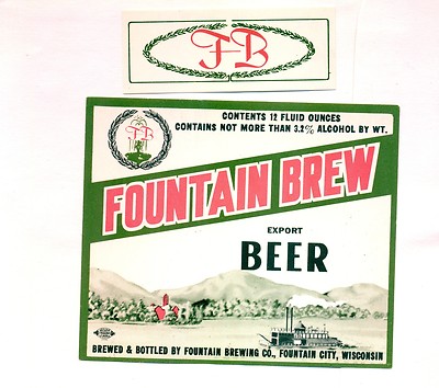 1950's Fountain Brew Beer Label Fountain, Of Fountain City, WI 12oz "3.2%"