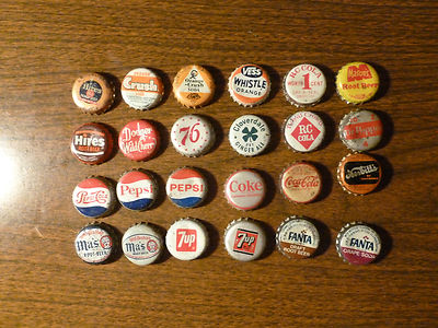 Title (ebay affiliate link): 24 different used cork-lined soda bottle caps. Coke,Cloverdale,Ma's,7Up,RC Cola