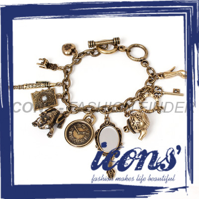 Mirror Clock Ring Heart Key Frog Multi Charms Bracelet Gold Vintage Fashion Pot
