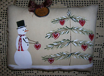 Primitive Winter VALENTINE Snowman Handpainted Pillow HEART Tree Snowman BE MINE