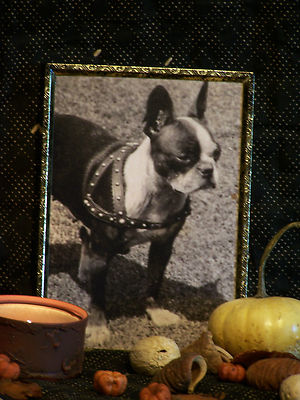 Title (ebay affiliate link): Boston Terrier-puppy dog/harness-framed-Primitive/Folk Art/Colonial VTG RE-PRINT