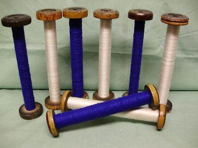 Title (ebay affiliate link): 8 VINTAGE TEXTILE WOODEN TEXTILE MILL SPOOLS, BOBBINS W/YARN