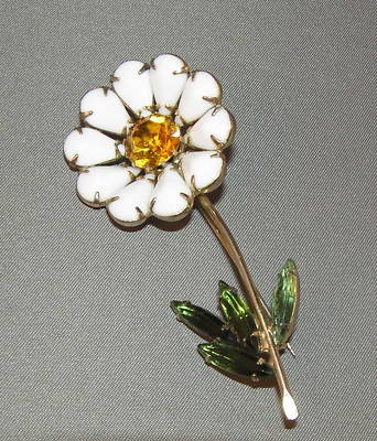 Lovely Vintage Milk Glass & Rhinestone Daisy Brooch