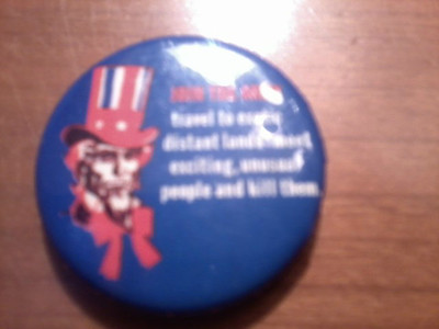 PIN button JOIN THE ARMY travel lands KILL PEOPLE exotic distant ANTI-WAR peace