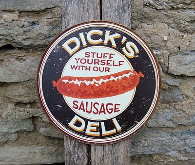 Title (ebay affiliate link): Vintage Look Dicks Sausage Deli Funny Metal Sign Ad Retro Garage Wall Decor 12"