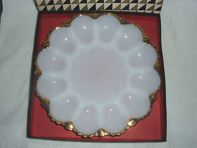 VINTAGE ANCHOR HOCKING MILK GLASS EGG PLATE GOLD TRIM