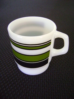 Title (ebay affiliate link): Vintage Milk Glass Anchor Hocking Fire King Mug with Olive Green & Black Stripes