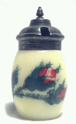 VINTAGE MILK GLASS MUSTARD JAR WITH PEWTER OR SILVER TOP & PAINTED ROSES