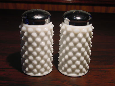 Title (ebay affiliate link): FENTON WHITE MILK GLASS HOBNAIL SALT & PEPPER SHAKER WARE # 3806-MI
