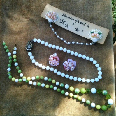 Title (ebay affiliate link): VTG Celluloid Sea Shell Sweater Guard & Earrings MILK GLASS Bead Necklace~Repair