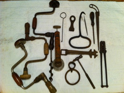 Vintage Lot Of 14 Tools Hay Hook, Tack Hammer, Key Hole Saw, Bug Sprayer, Wrench