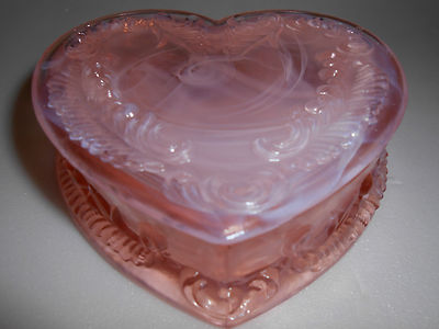 Title (ebay affiliate link): Pink & milk slag glass heart pattern powder jewelry box dresser tray holder ring