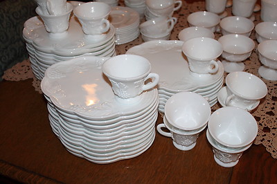 Title (ebay affiliate link): 10 White Milk Glass Harvest Grape Cup & Plate Snack or Dessert Sets #2