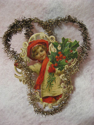 Title (ebay affiliate link): Antique Vintage Christmas Paper Scrap Die Cut Tinsel Ornament Child w Holly (J)
