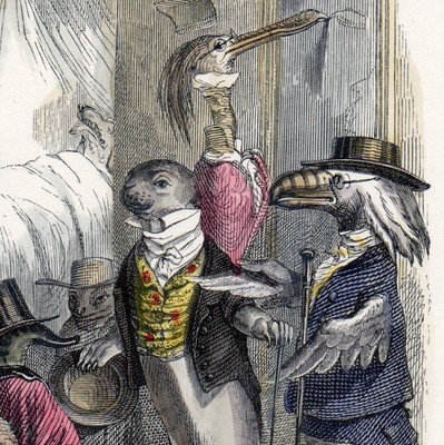 Title (ebay affiliate link): 1842 GRANDVILLE -THE WAITING ROOM - Seal Monkey Toucan - Hand Colored Engraving
