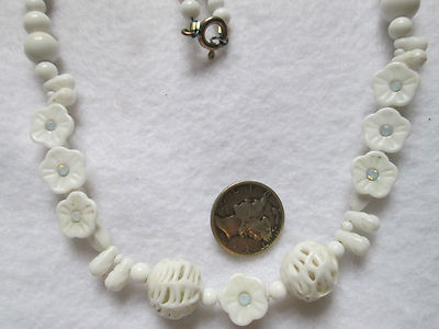Title (ebay affiliate link): Art Deco Antique White Milk Glass Molded Flowers Hollow Bead Glass Necklace 18"