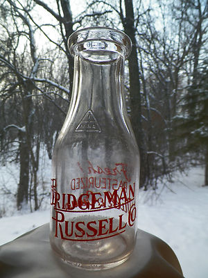 Title (ebay affiliate link): VINTAGE BRIDGEMAN RUSSELL MILK CREAM GLASS PINT BOTTLE ORANGE LETTERING