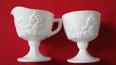 Title (ebay affiliate link): Colony White Milk Glass GRAPE HARVEST Creamer & Open Sugar Bowl Footed Indiana?