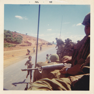 Vietnam photo- Army GIs on APC convoy keep watchful eyes on Coke girls