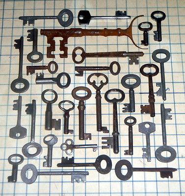 Antique Vtg old skeleton key lot furniture cabinet barrel padlock lock craft box