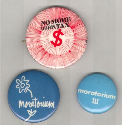 Title (ebay affiliate link): 3 anti Vietnam War Protest Pinbacks MORATORIUM Flower Power NO MORE WAR TAX