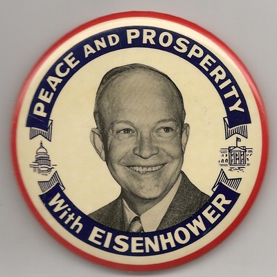 Title (ebay affiliate link): 3 1/2" Peace and Prosperity With Eisenhower IKE picture pinback button pin
