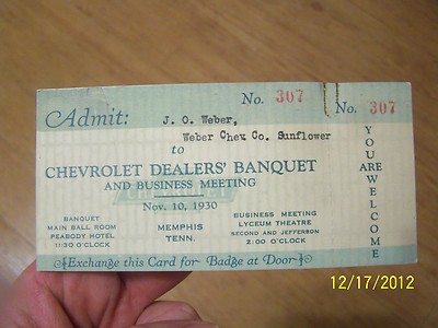 Title (ebay affiliate link): RARE ANTIQUE 1930 CHEVROLET CHEVY DEALERS' BANQUET TICKET PEABODY HOTEL MEMPHIS