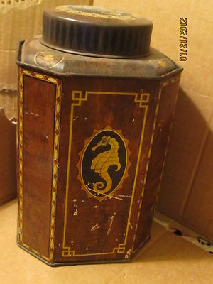 Antique tin. Beautiful, decorative and quite old. Seahorse on front of can
