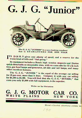 1911 G J G JUNIOR , WHITE PLAINS, NY ORIGINAL AUTO AD