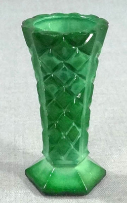 Title (ebay affiliate link): 1930 ART DECO BOHEMIAN SCHLEVOGT INGRID MALACHITE GREEN GLASS VASE ~HEXAGON BASE