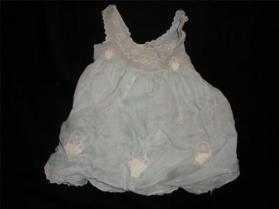 VINTAGE ANTIQUE COMPOSITION DOLL OR BABY OLD BLUE DRESS W/ EMBROIDERY