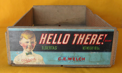 Title (ebay affiliate link): Vintage ELBERTAS PEACHES FRUIT CRATE Clifford C E WELCH Paper Label CALIFORNIA