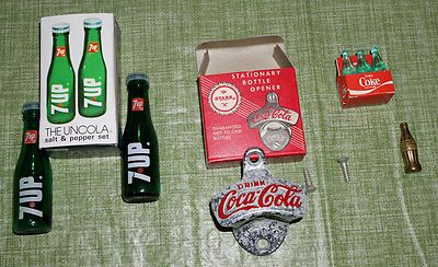 Title (ebay affiliate link): Coke Bottle opener, 7UP Salt & Pepper, Minature 6 pack of Coke, Gold Coke bottle