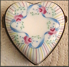 Title (ebay affiliate link): Vintage Trinket or Large Pill Box HEART-shaped w/ Roses & Blue Ribbon VGC