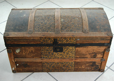 Title (ebay affiliate link): Antique Round Top Wood Trunk Embossed Tin Late 1800's With Tray Nice