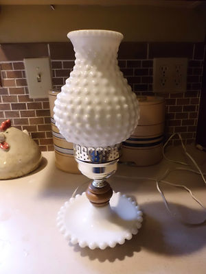 Title (ebay affiliate link): Vintage Hobnail White Milk Glass Table Lamp with Wood and Brass