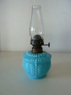 ANTIQUE MINIATURE BLUE MILK OPAQUE FEATHER DESIGN OIL KEROSENE LAMP NO RESERVE