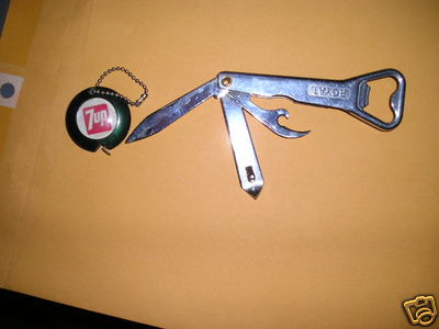 VINTAGE 7 UP 7UP tape Measure key chain Royal 4 in 1 Knife Bottle can Opener