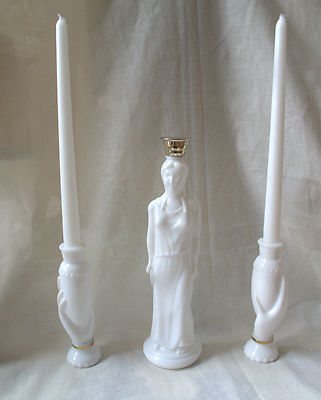 Title (ebay affiliate link): Vtg 1960s Greek Goddess Touch Hand Vase Candlesticks Milk Glass Tableware