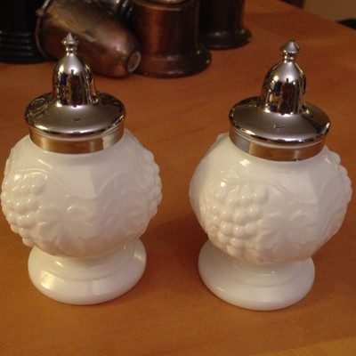 Title (ebay affiliate link): VINTAGE IMPERIAL MILK GLASS "GRAPE" SALT AND PEPPER SHAKERS, 3 3/8 IN