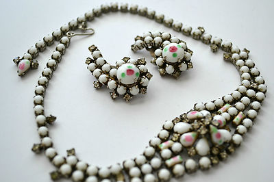 Title (ebay affiliate link): Vintage MilkGlass & Rhinestone Necklace & Earring SET Pink Flowers PRETTY!