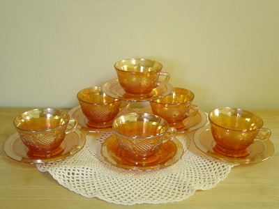 Title (ebay affiliate link): 6 Federal Depression Glass NORMANDIE Bouquet & Lattice Iridescent Cups & Saucers