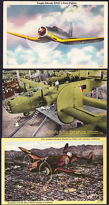 Lot of 3 Linen Postcards, WW2 Military Aircraft, XF4U-1, B-14, B-24 Factory