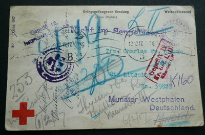 POSTCARD 1917 RED CROSS KOPENHAVN POW CAMP K160 MUNSTER GERMANY LINCOLN REGIMENT