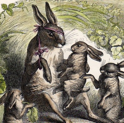 Title (ebay affiliate link): 1842 GRANDVILLE - THE INJURED RABBIT AND FAMILY -Bunnies -Hand Colored Engraving