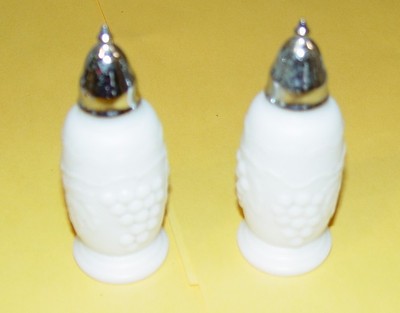 VINTAGE MILK GLASS EMBOSSED GRAPES SALT & PEPPER SHAKERS