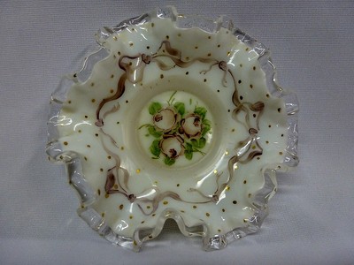 Title (ebay affiliate link): Fenton Silvercrest Milk Glass Charleton Hand Painted Ruffled Bowl