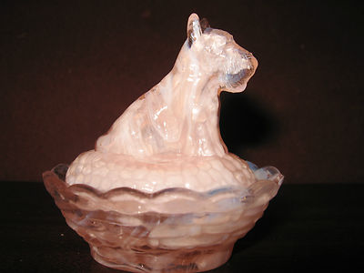 pink and white milk slag glass scottie dog salt cellar / celt on nest basket dip