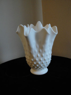 Title (ebay affiliate link): Vintage Fenton Milk Glass Hobnail Crimped or Handkerchief Style Vase